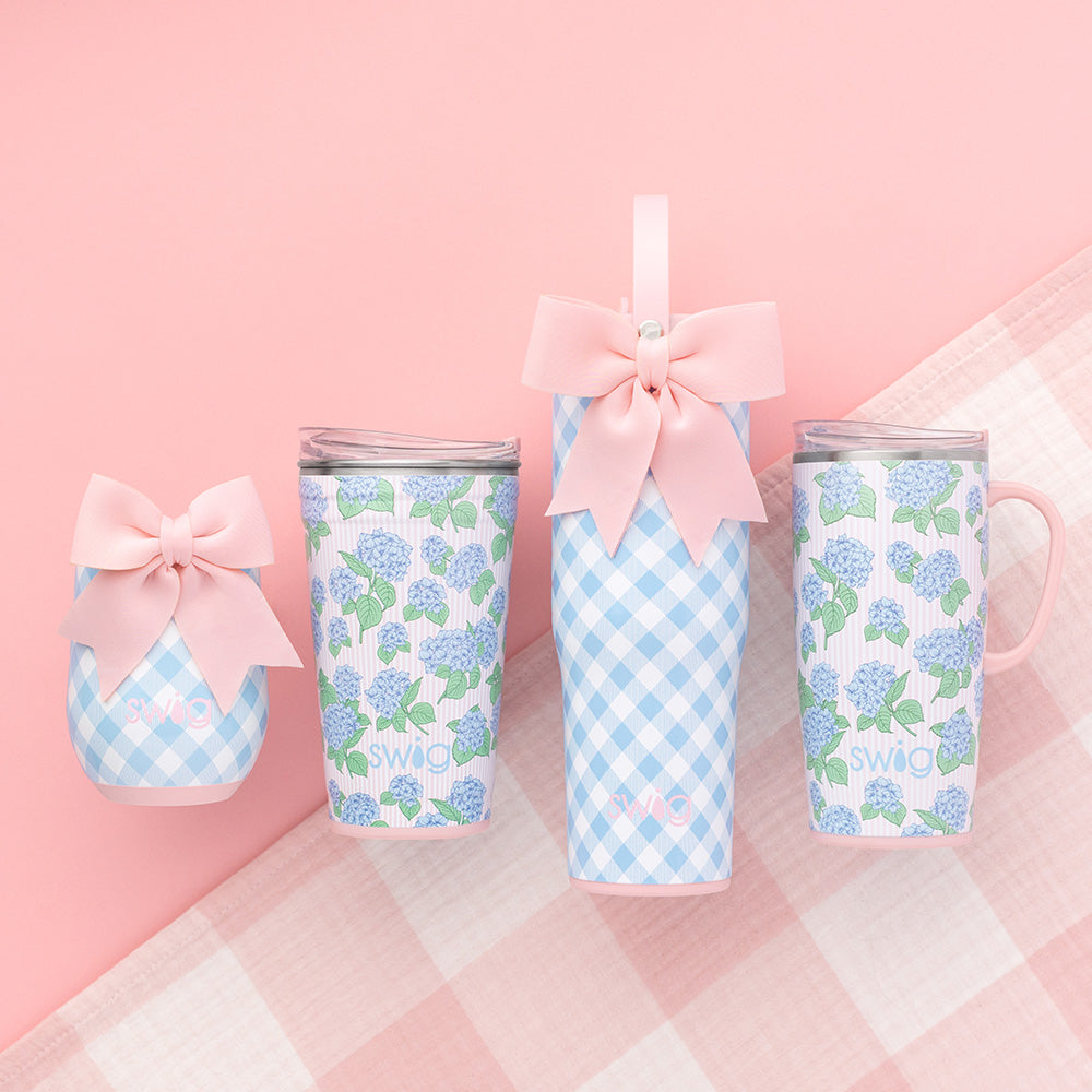 Hydrating made easy! 💧 This darling sky-blue gingham brings all the charm of a sunny picnic. A removable charming bow adorns each item like a gift.