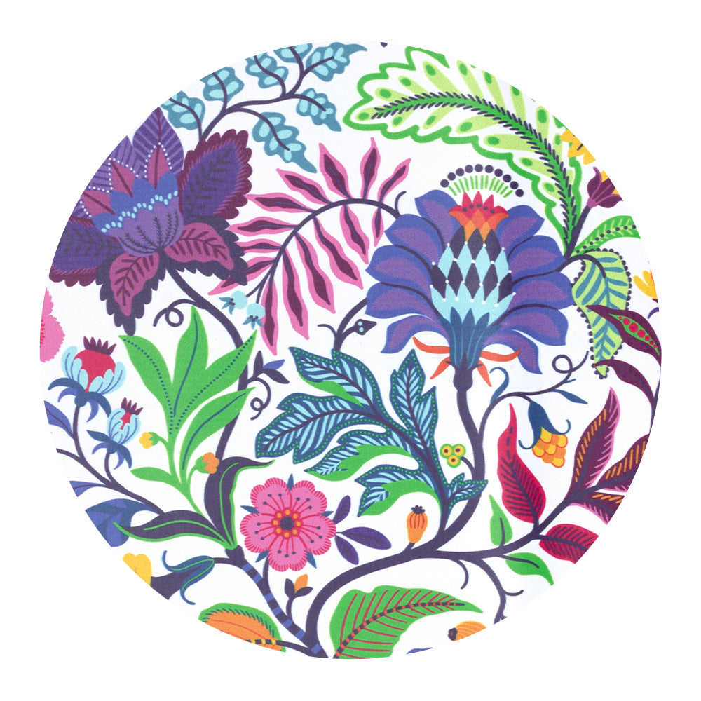 Lunch with style! 🥪 This print bursts with vibrant energy and color, featuring a kaleidoscope of bold florals, leafy botanicals, and tangling vines on a white background.