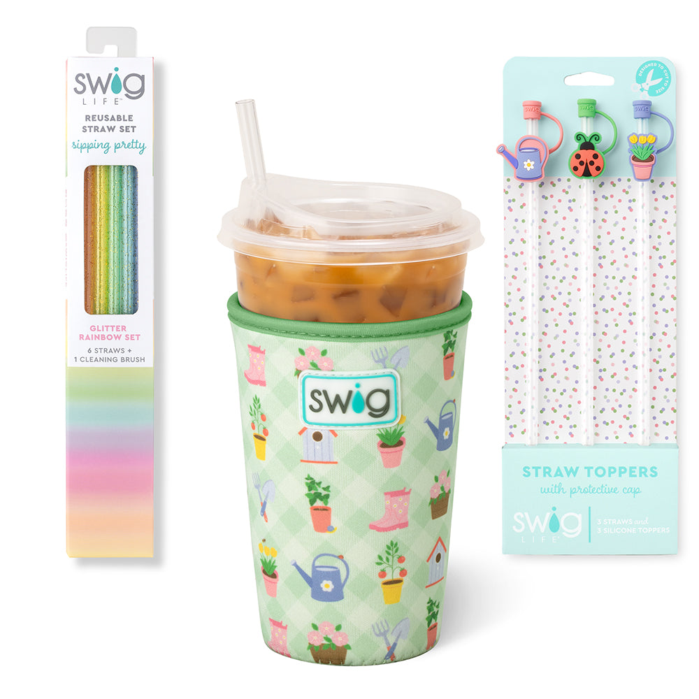 Accessory Bundle includes: one insulated Iced Cup Coolie with handle, one Reusable Straw set of 6 printed straws, and one Straw Topper set of 3 reusable straws with silicone charms featuring protective caps. Keep them all for yourself or share them with a friend!