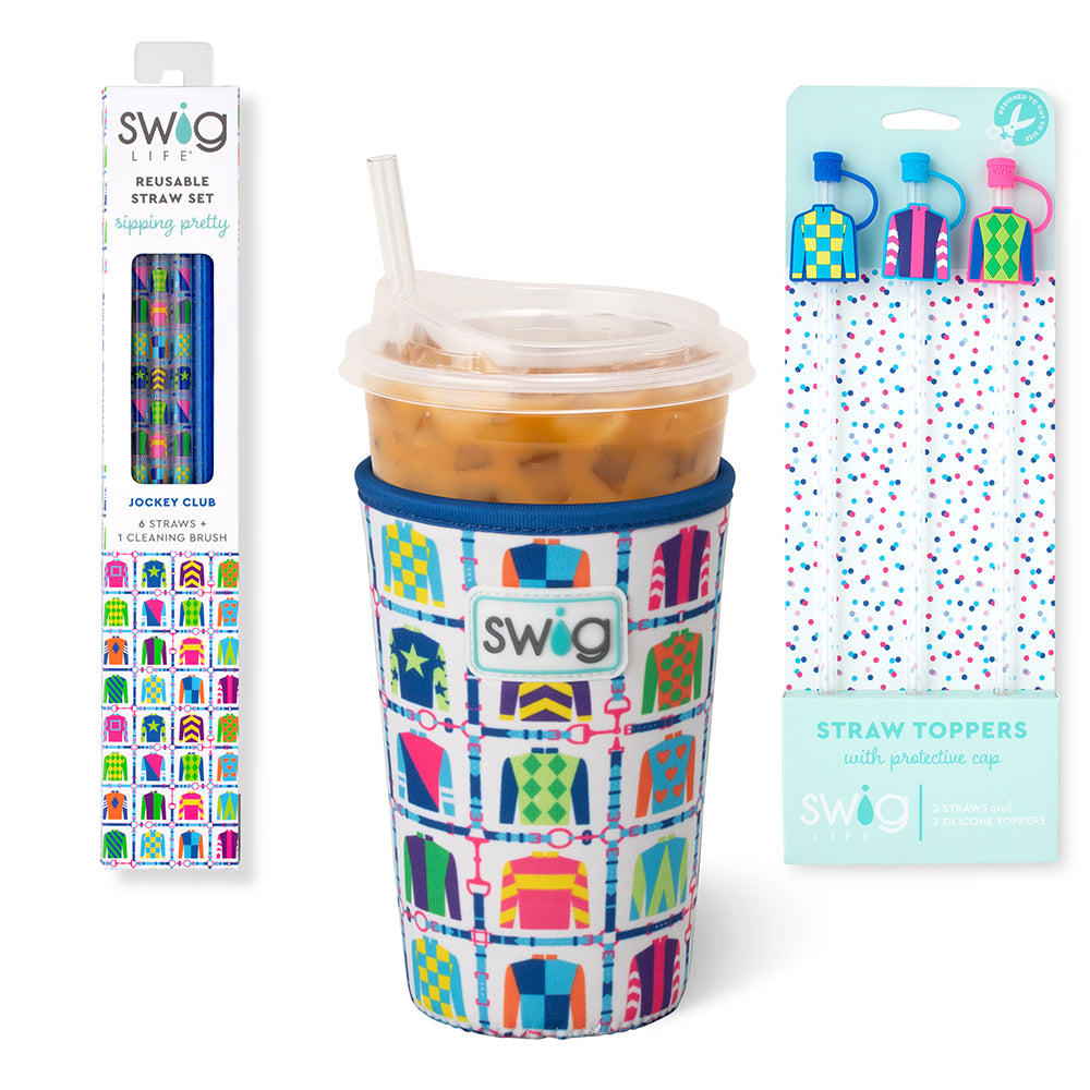Accessory Bundle includes: one insulated Iced Cup Coolie with handle, one Reusable Straw set of 6 printed straws, and one Straw Topper set of 3 reusable straws with silicone charms featuring protective caps. Keep them all for yourself or share them with a friend!