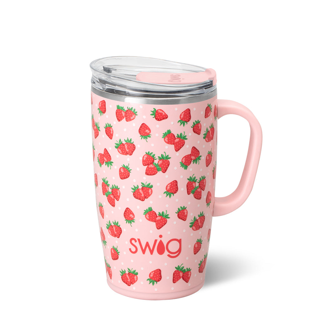 Take a "swig" of whatever fuels your day! ☕🚗 Stay berry sweet all season long with these fresh picked strawberries and charming polka dots on a glitter blush pink background.